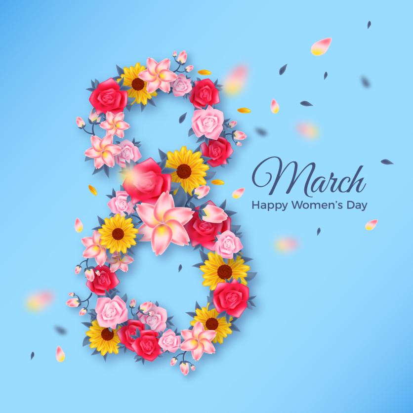 Beautiful International Women’s Day vector featuring the number 8 made of colorful flowers on a soft blue background. Ideal for March 8 greetings, cards, posters, banners, and elegant feminine celebration designs.