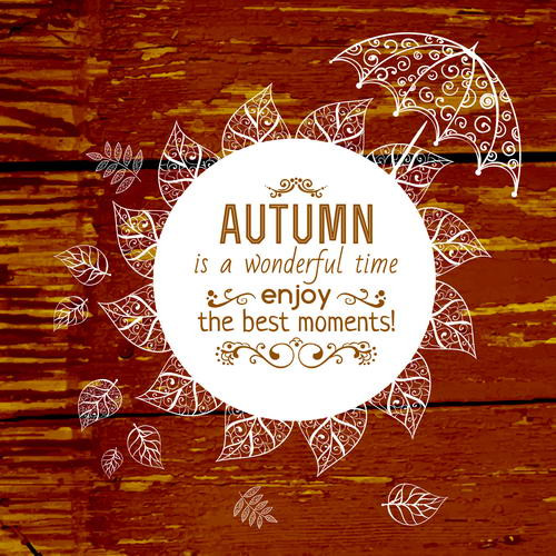 Elegant autumn-themed vector featuring decorative leaves, an umbrella, and an inspirational quote on a rustic wooden background. Perfect for seasonal designs, posters, greeting cards, social media graphics, and fall-themed creative projects.