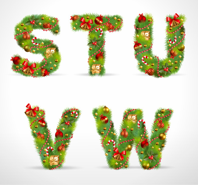 Charming Christmas alphabet vector featuring letters S to W made from lush pine branches decorated with baubles, ribbons, candy canes, and golden gifts. Perfect for Christmas cards, winter posters, and holiday typography. Download this festive vector set for creative seasonal designs.
