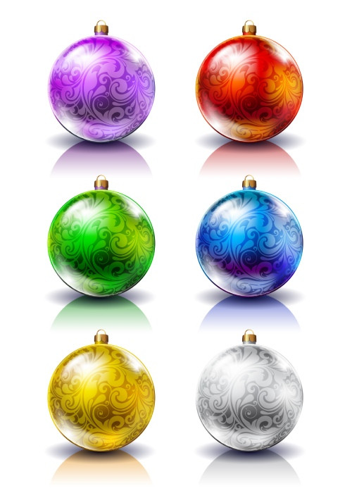 Download this vibrant Christmas ornaments vector set featuring six glossy baubles in purple, red, green, blue, gold, and silver. Each ornament includes elegant swirl patterns and realistic reflections, perfect for holiday designs, banners, greeting cards, and festive decorations. Ideal for high-quality Christmas vector projects.