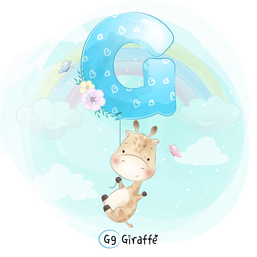 Adorable watercolor illustration of the letter G with a smiling giraffe holding a balloon, surrounded by flowers, clouds, butterflies, and a soft rainbow. Perfect for kids learning, alphabet charts, nursery decor, educational materials, and cute animal vector designs.