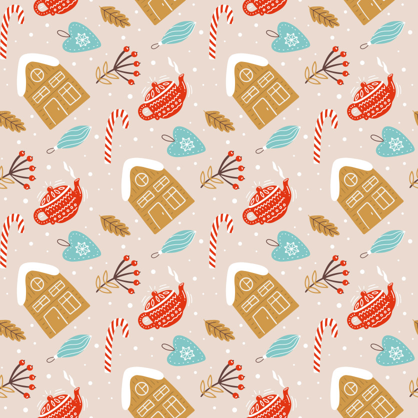 This festive seamless pattern features gingerbread houses, candy canes, cozy teapots, winter leaves, berries, and heart-shaped ornaments in a charming hand-drawn style. Perfect for Christmas cards, gift wrapping, fabric prints, and holiday design projects. Download this high-quality vector pattern for your creative winter and Christmas-themed artwork.