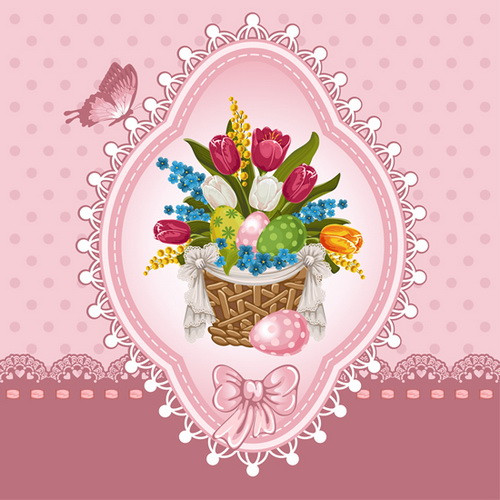 Charming Easter-themed vector featuring a decorative floral basket with colorful eggs, spring flowers, lace frame, and soft pink background. Perfect for Easter cards, holiday invitations, seasonal decorations, and festive spring design projects.