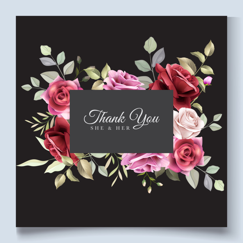 Beautiful thank you card vector featuring a luxury floral arrangement of red and pink roses with soft green leaves on a dark background. Perfect for thank you cards, wedding stationery, greeting cards, invitations, branding, and elegant design projects.