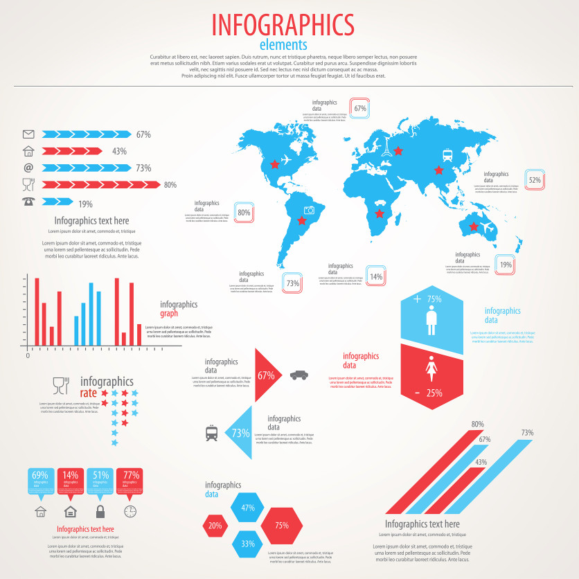 This clean and modern infographic vector set features a detailed world map, bar charts, percentage indicators, demographic data, hexagon elements, and comparison graphics in red and blue tones. Perfect for business reports, presentations, marketing dashboards, and educational materials. Fully editable and ideal for any data-driven design project.