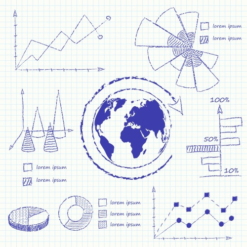 Creative hand-drawn style infographic vector featuring business charts, graphs, statistics, and a global map on grid paper. Ideal for analytics presentations, reports, education materials, startup concepts, and data visualization projects. Perfect for illustrating statistics, growth trends, and global business insights in a sketch-style design.