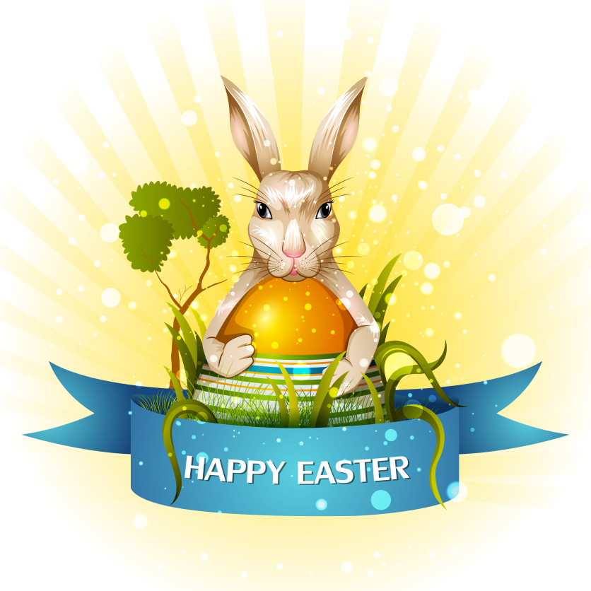 Bright Easter vector illustration featuring a cute bunny holding a golden Easter egg with glowing rays and a “Happy Easter” ribbon. Perfect for Easter greeting cards, holiday banners, posters, invitations, spring promotions, and festive seasonal designs.