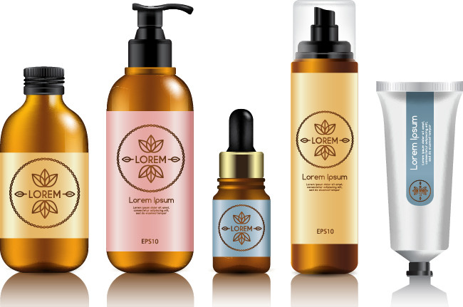 Elegant organic cosmetic packaging vector featuring amber bottles, droppers, and tubes with soft pastel labels. Ideal for natural skincare branding, beauty product packaging, cosmetic mockups, and modern marketing design projects.