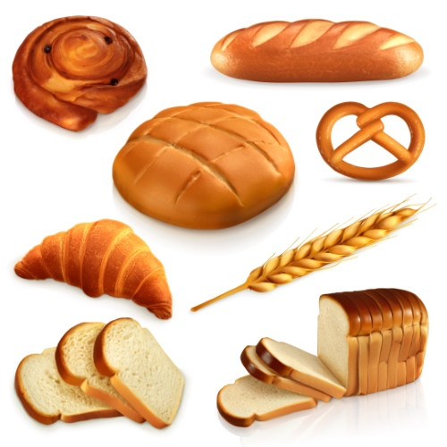 This is a high-quality, photorealistic vector icon set featuring a variety of popular bakery products and bread types. The detailed shading and warm golden-brown color palette make these graphics ideal for food and culinary projects.