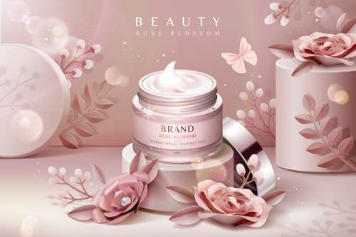 Soft and elegant skincare vector featuring a rose blossom cream jar with delicate floral elements and a pastel pink aesthetic. Ideal for cosmetic advertising, beauty branding, product packaging, banners, and luxury skincare design projects.