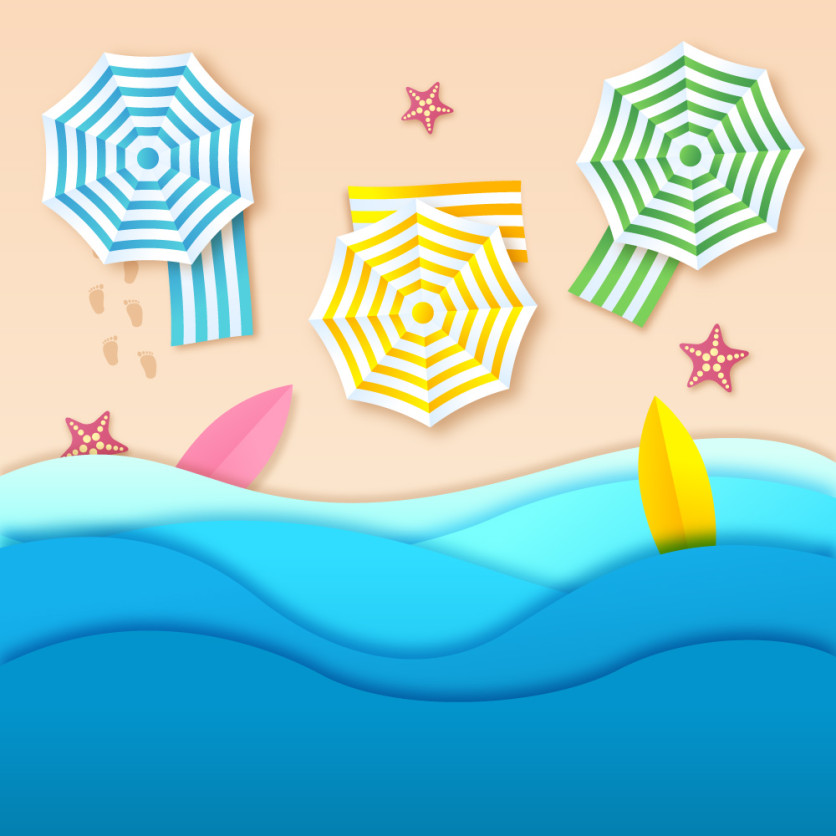 Vibrant top view summer beach vector illustration featuring striped beach umbrellas, ocean waves, surfboards, starfish, and sandy shore elements. Perfect for summer vacation designs, beach banners, travel promotions, tourism posters, and seaside-themed graphic projects.