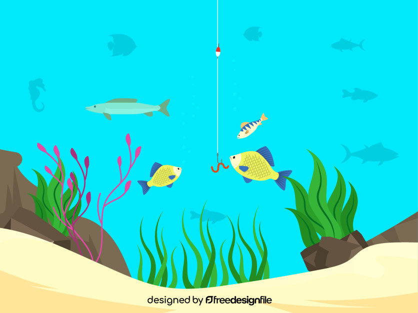 A lively underwater vector illustration featuring fish swimming around a fishing hook with bait, surrounded by sea plants, rocks, and aquatic silhouettes. Perfect for fishing-themed designs, educational materials, marine projects, and creative vector artwork. Fully editable for professional and personal use.