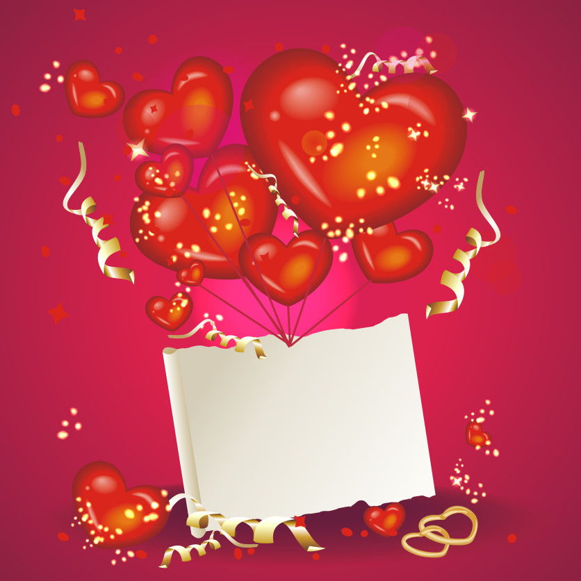 Romantic Valentine’s Day vector featuring glowing red heart balloons rising from a blank greeting card, decorated with sparkles, ribbons, and love elements. Ideal for Valentine cards, love messages, wedding designs, romantic invitations, posters, and festive holiday backgrounds.