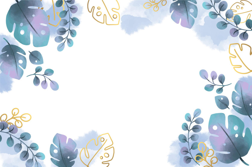 Modern watercolor blue tropical leaves frame with soft pastel washes and elegant gold line accents. Ideal for invitations, branding, posters, social media designs, wedding stationery, and minimalist botanical layouts.
