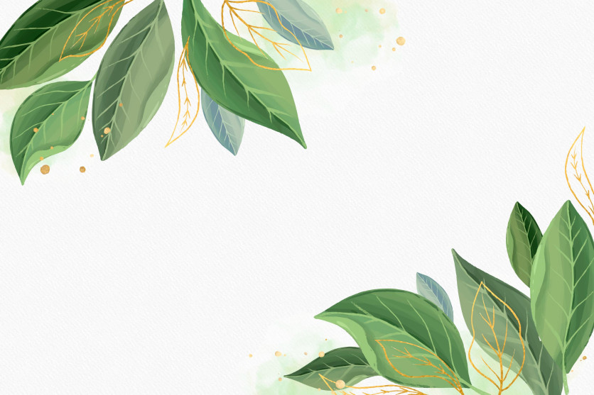 Elegant watercolor green leaves frame background with soft gold accents on a textured white canvas. Perfect for nature-inspired designs, invitations, branding, posters, stationery, and eco-friendly layouts.