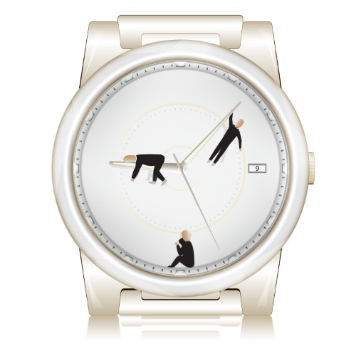 A clever and visually engaging vector illustration featuring a stylized, modern wristwatch. The unique design replaces traditional hands with miniature human figures in business attire acting as indicators for the time. One figure is shown running or leaping, one is sitting thoughtfully, and another is preparing to start, symbolizing the dynamic relationship between time, movement, work, and life management.